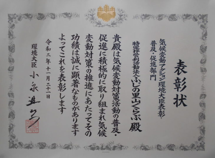 このたび、NPO法人 ふじの里山くらぶは「気候変動の藤野学」の活動において、『令和 2 年度 気候変動アクション環境大臣表彰』を受賞いたしましたので、ご報告いたします。 この賞は、気候変動の緩和及び気候変動への適応に顕著な功績のあった個人又は団体... -